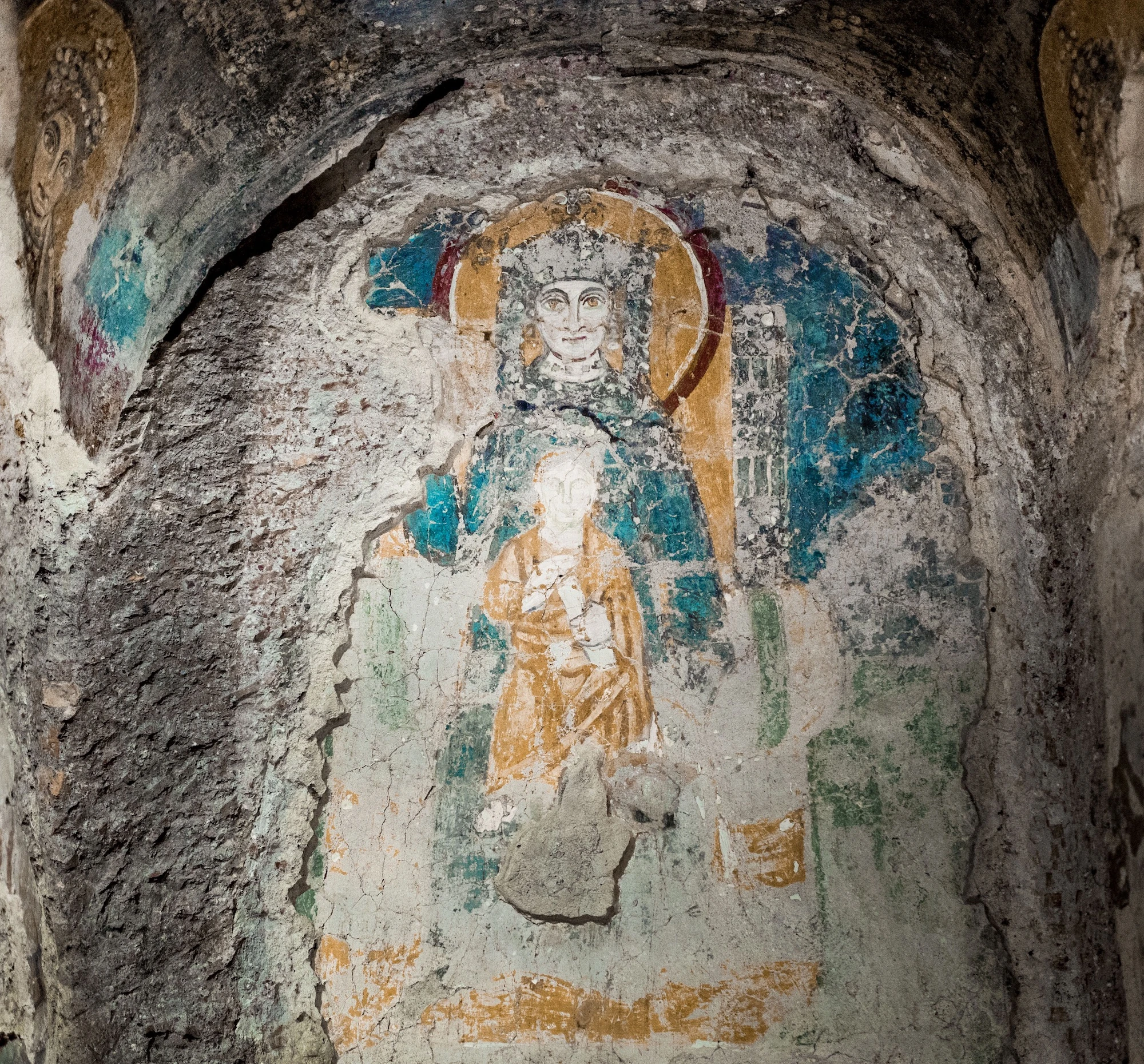 The most important fresco in the aisle is next, in a round-headed niche, and is of the Madonna and Child. It is thought that it was originally of the empress Theodora (died 548), and was converted into a portrait of Our Lady through the addition of the Holy Child and a throne perhaps in the 9th century. This theory depends on the rather striking portraiture of Our Lady, which is thought to resemble the mosaic depiction of the Empress at the church of San Vitale in Ravenna. The figure is (or was) accompanied by two court attendants, according to the theory, who were converted to SS Catherine and Euphemia.