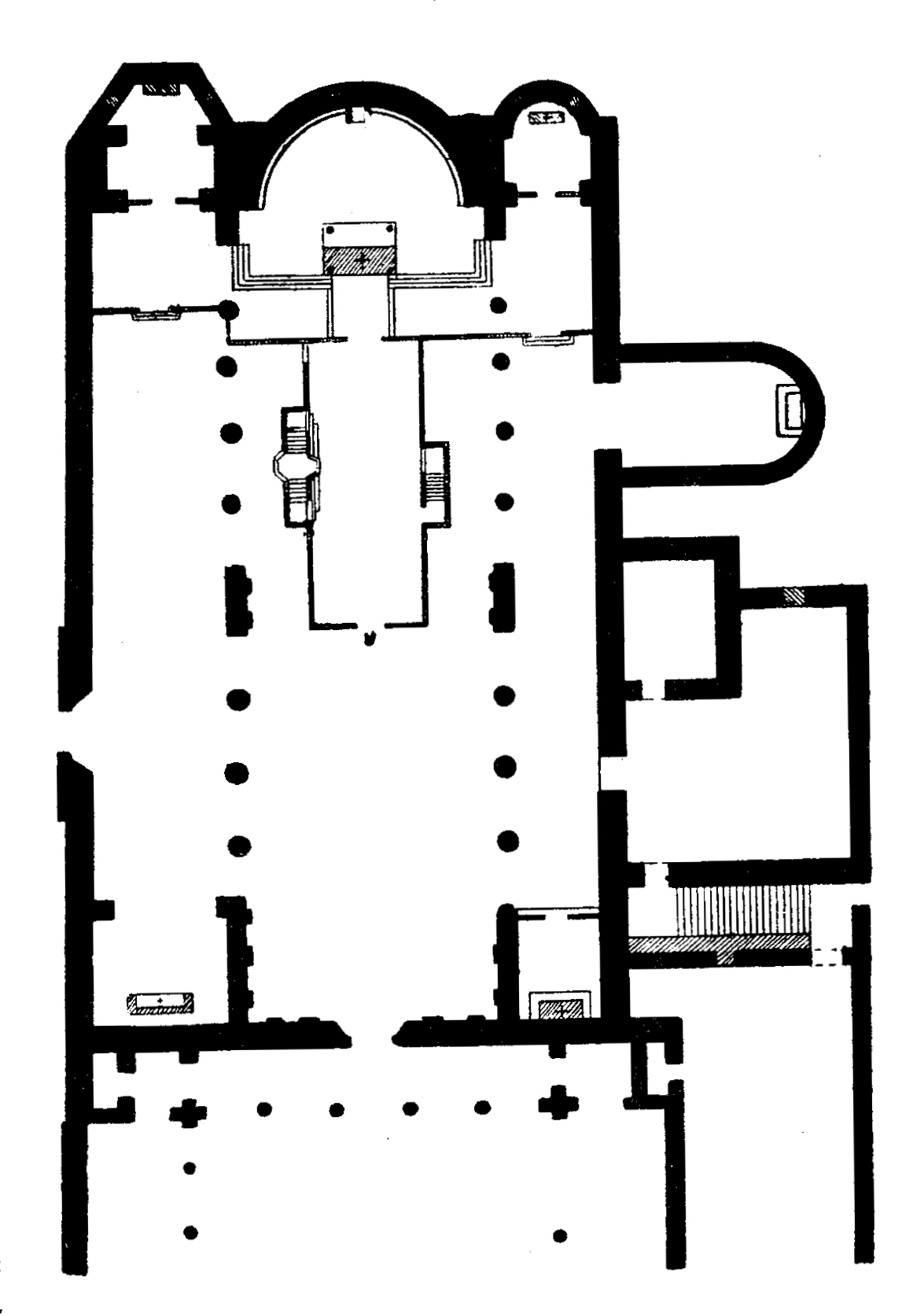 At the end of the right hand aisle was a sacristy, and there were probably another one on the other side of the apse. The latter was semi-circular, not on the plan of the present apse above but to the right (you can view the old apse behind the foundation wall of the new one). There was no transept.