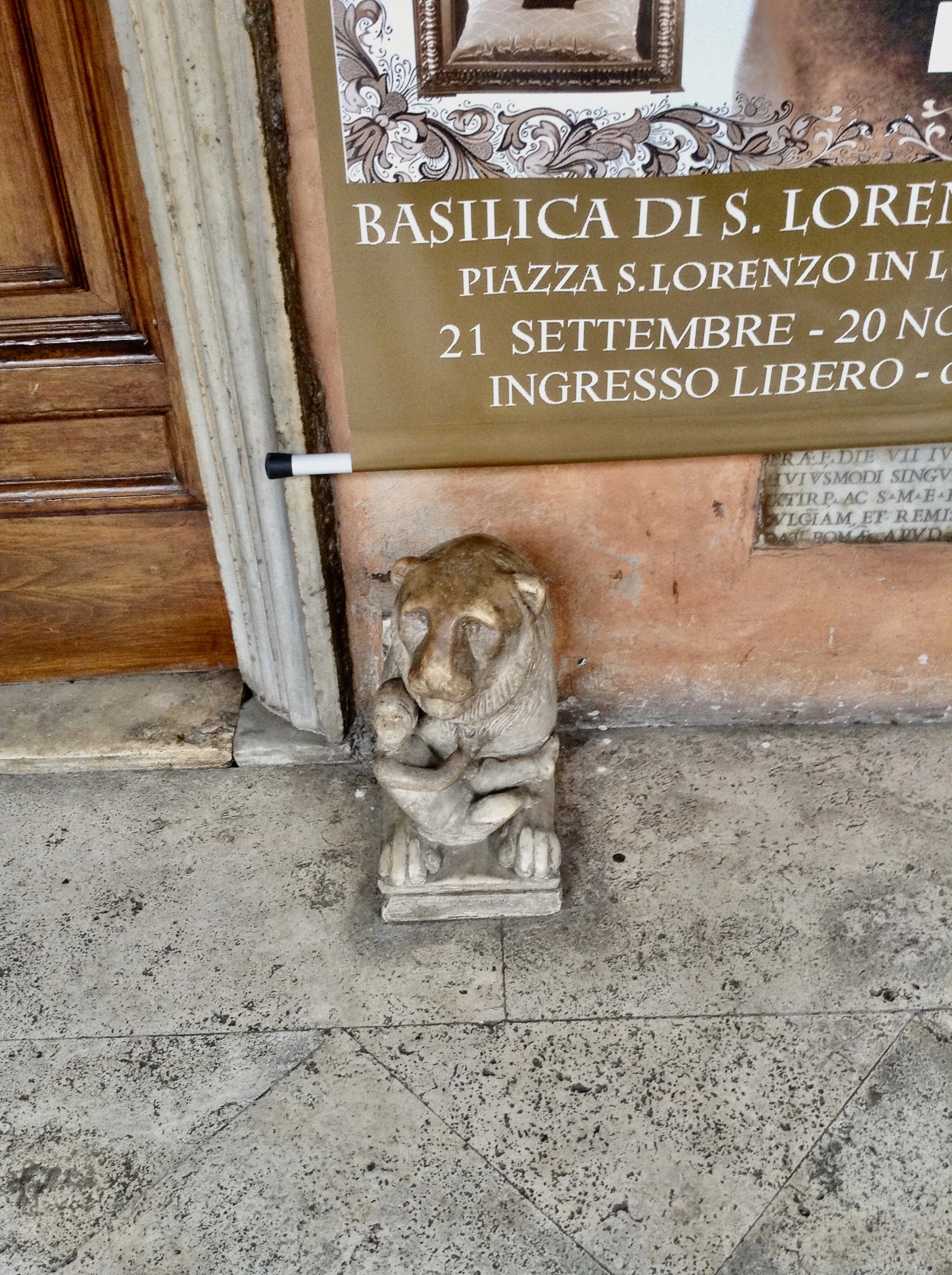 Two genial-looking medieval stone lions flank the entrance door, guarding their lunches; one has a lamb, and the other a human baby.