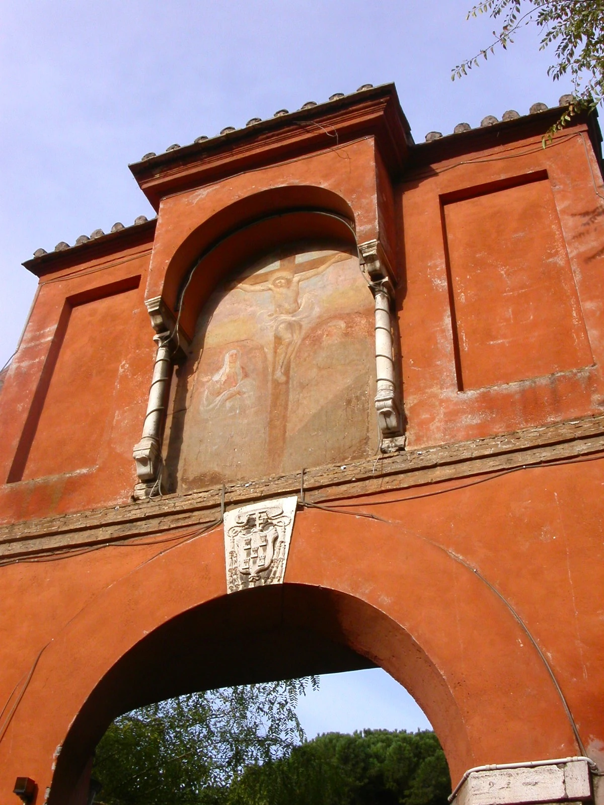 The coat of arms on the keystone below the fresco is of the family of the restorers of the church in 1606, Cardinals Ludovico and Cosimo de Torres (note the towers on the shield).