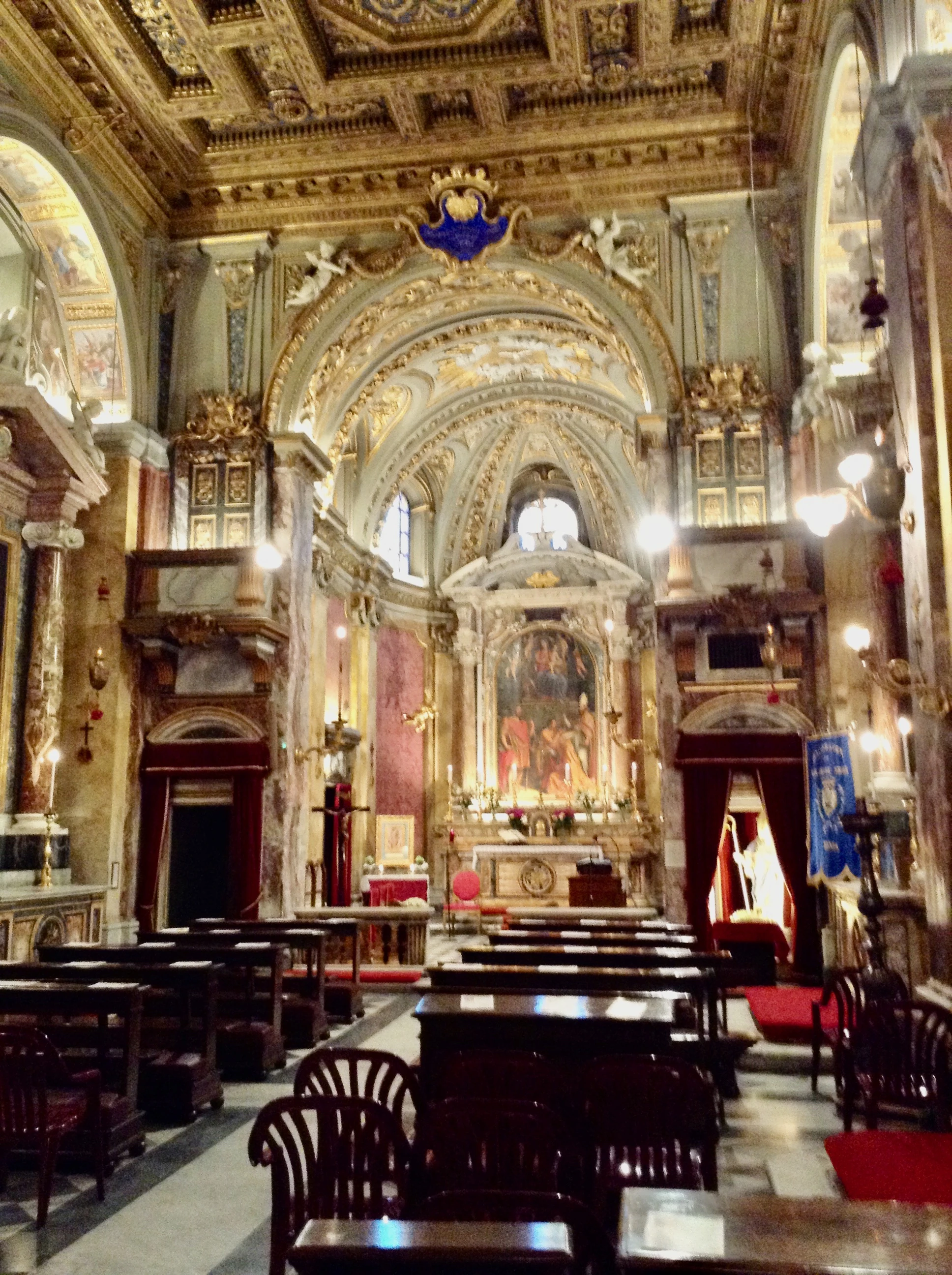The spectacular coffered ceiling is intricately carved and almost completely gilded, with some blue bits in the lacunae. The central panel shows the emblem of the Confraternity, including an anvil.