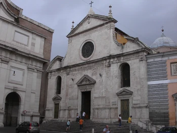 The dedication is to the Blessed Virgin Mary, who has three churches dedicated to her on the piazza -the others are Santa Maria dei Miracoli and Santa Maria in Montesanto.