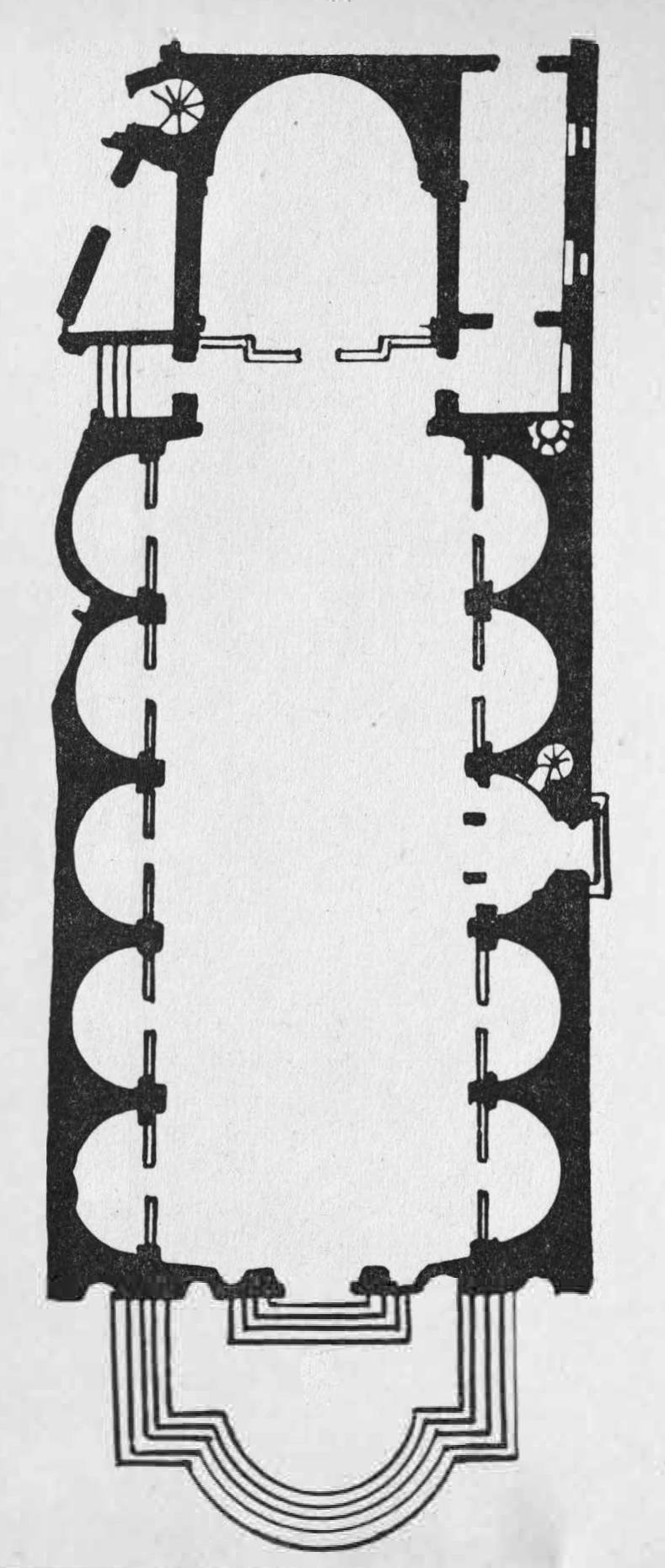 The church has a single nave of five bays, with nine apsidal chapels along the sides. Five of these are to the left, and four of these to the right. The latter flank an apse containing a side entrance which is in the third bay.